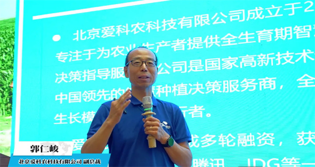 北京愛科農科技有限公司副總裁郭仁峻及楊曉勇出席了會議,郭總做了專題報告——“愛科農智慧農業(yè)創(chuàng)新與實踐”。北京愛科農依托強大的研發(fā)實力和先進的作物-土壤-大氣連續(xù)體模型,構建了強大的作物智慧種植決策系統(tǒng)。該系統(tǒng)可因地制宜地實現良種和良法有機結合、協(xié)助種業(yè)公司、經銷商和種植者充分挖掘新品種的生產潛力、展示新品種的價值、顯著提高農業(yè)種植效益。愛科農與縱橫種業(yè)的攜手合作,共同打造高標準示范田,這一舉措無疑將優(yōu)良品種與新科技緊密結合,為農業(yè)生產注入了新的活力。通過高標準示范田的展示,農民可以直觀地看到優(yōu)良品種與先進科技結合所帶來的增產增收效果,也將極大地促進縱橫種業(yè)品種的推廣。