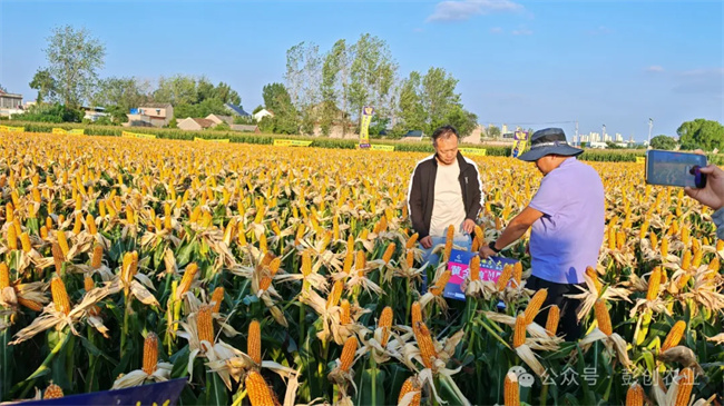 觀摩會(huì)場(chǎng)面極其壯觀,人們穿梭在玉米田間,仔細(xì)觀察著玉米的生長(zhǎng)狀況,分享彼此的種植體驗(yàn)和推廣心得,個(gè)個(gè)臉上洋溢著滿意的笑容。他們對(duì)黃金糧 MY73 品種的表現(xiàn)給予高度認(rèn)可,并紛紛表示,黃金糧MY73將是他們未來種植的重要選擇。