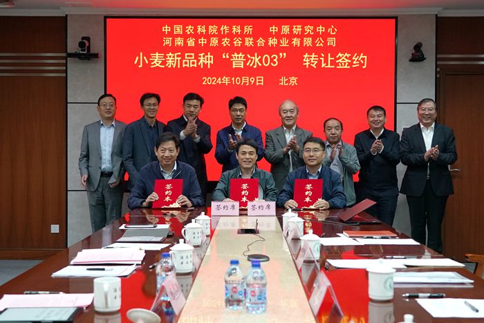 10月9日,中國農(nóng)業(yè)科學(xué)院作物科學(xué)研究所、中原研究中心與河南省中原農(nóng)谷聯(lián)合種業(yè)有限公司在京舉行小麥遠(yuǎn)緣雜交新品種“普冰03”使用權(quán)轉(zhuǎn)讓協(xié)議簽約儀式。中國農(nóng)業(yè)科學(xué)院黨組書記楊振海、中國工程院院士劉旭、中國科學(xué)院院士錢前、新鄉(xiāng)市副市長(zhǎng)劉軍偉出席會(huì)議并講話。