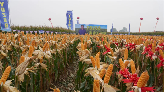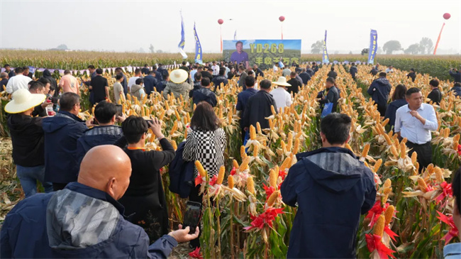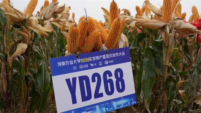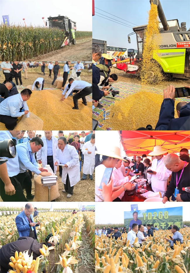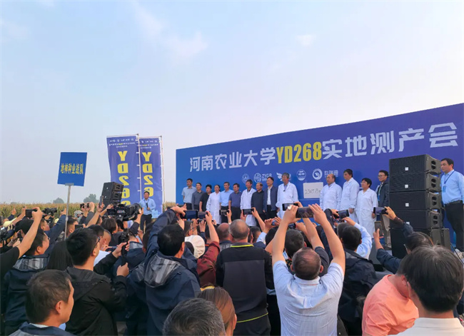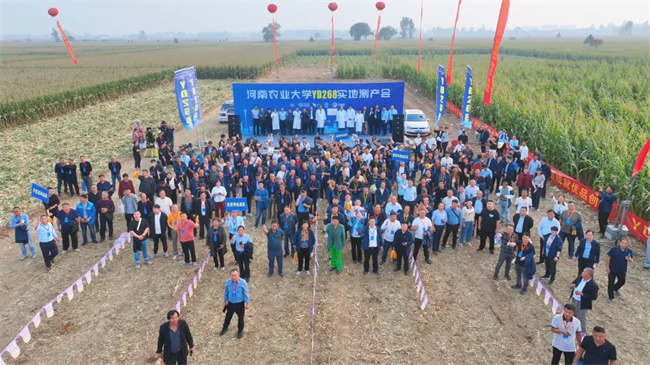 金秋時(shí)節(jié),正值喜迎豐收和播種希望之時(shí)。10月9日,河南農(nóng)業(yè)大學(xué)選育的玉米新品種YD268實(shí)地測(cè)產(chǎn)觀摩會(huì)在素有“豫北糧倉”之稱的河南省鶴壁市舉行。河南農(nóng)業(yè)大學(xué)校黨委書記李成偉,原校長(zhǎng)介曉磊,學(xué)術(shù)副校長(zhǎng)、農(nóng)學(xué)院院長(zhǎng)王道文,學(xué)術(shù)副校長(zhǎng)、YD268育種團(tuán)隊(duì)負(fù)責(zé)人湯繼華出席活動(dòng)。學(xué)校黨委辦公室、黨委宣傳部、社會(huì)服務(wù)處、農(nóng)學(xué)院負(fù)責(zé)人,YD268育種團(tuán)隊(duì)成員,河北兆育種業(yè)集團(tuán)有限公司、北京豐度高科種業(yè)有限公司、河南黃泛區(qū)地神種業(yè)有限公司、河南慧博科瑞迪農(nóng)業(yè)科技有限公司主要負(fù)責(zé)人,以及來自黃淮海玉米主產(chǎn)區(qū)8個(gè)省區(qū)的種子經(jīng)銷商和種糧大戶400余名匯聚在此,共同見證YD268的機(jī)收籽粒現(xiàn)場(chǎng)測(cè)產(chǎn)。