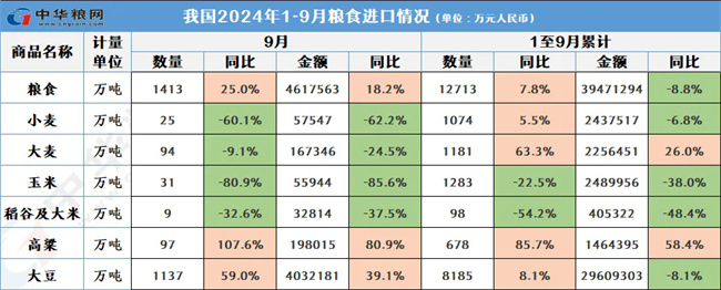 10月18日,海關(guān)總署發(fā)布最新數(shù)據(jù),2024年1-9月我國(guó)累計(jì)進(jìn)口糧食量為1.27億噸,同比增長(zhǎng)7.8%;進(jìn)口金額為3947.1億元人民幣,較去年減少8.8%。