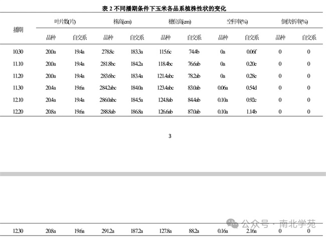 2.2 不同播期對(duì)各品系植株性狀的影響=對(duì)不同播期品系的植株性狀進(jìn)行調(diào)查,取其平均值記錄于表2。從中可以看出,隨著播期的延遲,品系之間葉片數(shù)目都有一定程度的增加,但是均沒(méi)有達(dá)到顯著水平。植株高度變化品系之間存在差異,雜交種方面12月30日播期的株高最高,顯著高于11月 20 日、11月10日和10月30日的播期株高,12月20日播期株高顯著高于 10月30日播期株高,其它播期間株高不存在差異顯著性;自交系方面株高之間不存在差異顯著性。穗位方面品系之間都存在較大差異,雜交種方面 12月30日播期的穗位最高,顯著高于11月10日和10月30日的播期穗位,12月20日播期穗位顯著高于10月30日播期穗位,其它播期間穗位不存在差異顯著性;自交系方面12月30日播期的穗位最高,顯著高于10月30日的播期穗位,其它播期間穗位不存在差異顯著性。在空稈率上隨著播期延遲,品系之間空稈率都有不斷增大的趨勢(shì),雜交種之間無(wú)差異顯著性,自交系除了11月10日和11月20日播期空稈率之間不存在顯著差異性外,其它播期之間均達(dá)到顯著水平。由于整個(gè)玉米生長(zhǎng)季沒(méi)有強(qiáng)風(fēng)天氣,不同播期的玉米品系均沒(méi)有倒伏和倒折現(xiàn)象發(fā)生。通過(guò)上述試驗(yàn)結(jié)果知道,南繁播期延遲一定程度上會(huì)增加玉米的葉片數(shù)目、植株高度、穗位高度和空稈率,特別是空稈率的增加會(huì)降低玉米收獲產(chǎn)量,影響以產(chǎn)量為目標(biāo)的繁殖、復(fù)配和測(cè)配等試驗(yàn),所以南繁科研中涉及產(chǎn)量的試驗(yàn)建議早播為宜。