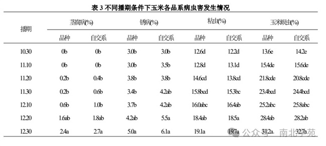 2.3 不同播期各品系病蟲(chóng)害的發(fā)生情況:表 3 反應(yīng)出不同播期玉米病蟲(chóng)害的發(fā)生情況??梢钥闯?,播期延遲莖腐病、銹病、粘蟲(chóng)和玉米螟蟲(chóng)發(fā)病都有不同程度的增加,播期越晚病蟲(chóng)害越重。莖腐病方面品系之間表現(xiàn)一致,12月30日播期顯著高于12月10日以前播期,其它播期間不存在差異顯著性;銹病方面品系之間有所不同,雜交種12月30日播期顯著高于12月10 日以前播期,自交系12月20日以后播期不存在差異顯著性,顯著高于11 月20日以前播期,12月10日之前播期不存在差異顯著性;在粘蟲(chóng)發(fā)病上品系之間也有所差異,雜交種方面12月30日播期顯著高于11月30日之前播期,12月20日播期顯著高于11月20日之前播期,12月10日播期顯著高于11月10日之前播期,其它播期間不存在差異顯著性;自交系方面12月20 日之后播期顯著高于11月30日之前播期,12月10 日之后播期顯著高于11 月20日之前播期,11月30日之后播期顯著高于11月10日之前播期,其它播期間不存在差異顯著性。在玉米螟蟲(chóng)發(fā)病上品系表現(xiàn)相同,12月30日播期顯著高于11月30日之前播期,12月20日之后播期顯著高于11月20日之前播期,12月10日之后播期顯著高于11月10日之前播期,11月30日之后播期顯著高于10月30日播期,其它播期間不存在差異顯著性。從病蟲(chóng)害發(fā)生程度來(lái)看,早播玉米病害發(fā)生程度輕,可適當(dāng)縮減防治病蟲(chóng)害農(nóng)藥使用量,降低田間管理難度,保護(hù)農(nóng)田生態(tài)環(huán)境,節(jié)省科研投入。