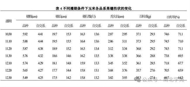 2.4 不同播期果穗性狀及產(chǎn)量的變化:對(duì)收獲后的各品系重復(fù)小區(qū)間的果穗性狀進(jìn)行調(diào)查,取平均值記錄于表 4。可以看出,隨著播期延后,穗粗、穗長(zhǎng)、穗行數(shù)、百粒重和出籽率等性狀都不斷減小,而禿尖長(zhǎng)不斷增加。對(duì)比 10月 30日和 12月 30日播期,平均穗粗雜交種減小了 0.43cm,自交系減小了0.16cm;平均穗長(zhǎng)雜交種減小了 2.2cm,自交系減小了 1.1cm;平均穗行數(shù)雜交種減小了 0.5 行,自交系減小了 0.4 行;平均百粒重雜交種減小了 1.8g,自交系減小了 1.9g;平均出籽率雜交種減少了 4.9%,自交系減少了 6.9%;平均禿尖長(zhǎng)雜交種增加了 0.95cm,自交系增加了 0.98cm。由此可見(jiàn),播期延后果穗性狀向劣勢(shì)方向發(fā)展,直接或間接的影響了產(chǎn)量潛力的發(fā)揮。