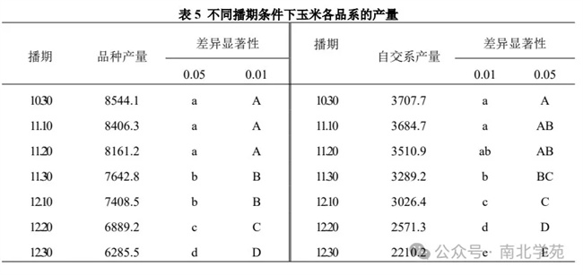 對(duì)不同播期品系產(chǎn)量進(jìn)行方差分析和顯著性檢驗(yàn),結(jié)果列于表5??梢钥闯觯s交種方面 10月30日播期產(chǎn)量最高達(dá) 8544.1kg/hm2,隨播期延后產(chǎn)量逐漸降低,12月30日播期產(chǎn)量最低為6285.5 kg/hm2,11月20日之前播期產(chǎn)量極顯著高于11月30日之后播期,12 月10日之前播期極顯著高于 12 月 20 日之后播期,12 月 20 日之前播期極顯著高于 12 月 30日播期,其它播期間不存在差異顯著性;自交系的產(chǎn)量變化趨勢(shì)與雜交種相同, 10月30日播期產(chǎn)量最高為 3707.7kg/hm2,12 月 30 日播期產(chǎn)量最低為 2210.2 kg/hm2,10 月 30 日播期極顯著高于 11 月 30 日之后播期,11 月 20 日之前播期極顯著高于 12 月 10 日之后播期,11 月 30 日之前播期極顯著高于 12 月 20 日之后播期,12 月 10 日、12 月 20 日和 12 月 30日播期之間均存在極顯著差異性,11 月 10 日和 11 月 30 日播期之間不存在極顯著差異性,但差異達(dá)到顯著水平,其它播期之間不存在差異顯著性。通過(guò)以上品系產(chǎn)量結(jié)果得出,南繁適時(shí)早播會(huì)有效提高玉米產(chǎn)量。對(duì)于繁、制種來(lái)說(shuō),在躲避臺(tái)風(fēng)影響后,盡早整地、播種,充分利用光熱條件,適時(shí)灌溉并加強(qiáng)田間管理,為實(shí)現(xiàn)較高產(chǎn)量奠定良好基礎(chǔ)。