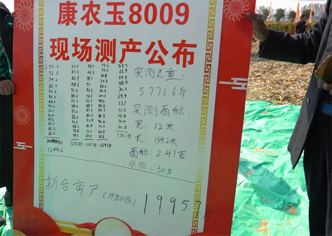 由經(jīng)銷商代表及種植大戶組成的測(cè)產(chǎn)組,按照玉米田間實(shí)收測(cè)產(chǎn)要求,通過(guò)詳細(xì)記錄、測(cè)量籽粒水分、稱重、折算等流程,在參會(huì)人員的共同見(jiàn)證下,經(jīng)測(cè)定,康農(nóng)玉8009平均畝產(chǎn)為1995.7斤!在今年這樣的極端天氣條件下,能有這樣優(yōu)秀的表現(xiàn),充分體現(xiàn)了品種具有優(yōu)良的豐產(chǎn)性!收獲的籽粒金黃透亮,沒(méi)有穗腐,獲得了參會(huì)人員的一致好評(píng)。