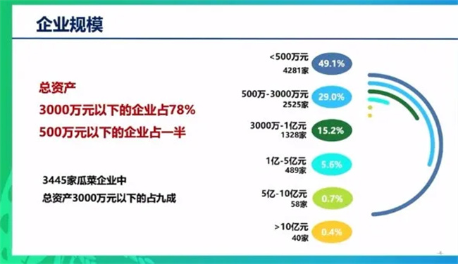 從企業(yè)的規(guī)模來看,我國的種業(yè)企業(yè)還是以3,000萬元以下的中小企業(yè)為主體,總資產(chǎn)3,000萬元以下的企業(yè)占近8成,500萬元以下的企業(yè)占了一半,特別是對于瓜菜企業(yè),3400多家瓜菜企業(yè)中,總資產(chǎn)3,000萬元以下的占了9成。