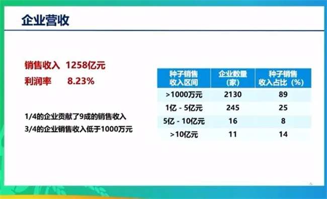 從企業(yè)的營收看,2023年全國種業(yè)企業(yè)共實現(xiàn)種子銷售收入1,258億元,平均的利潤率8.23%,1/4企業(yè)貢獻銷售收入的9成, 3/4的企業(yè)銷售收入低于1,000萬元。具體來看,銷售收入超過1,000萬元以上的企業(yè)有2130家,占種子銷售收入的89%;1億元到5億元的企業(yè)有245家,占種子銷售收入的25%;5億元到10億元的企業(yè)16家,占種子銷售收入的8%;超過10億元的企業(yè)11家,占種子銷售收入的14%。