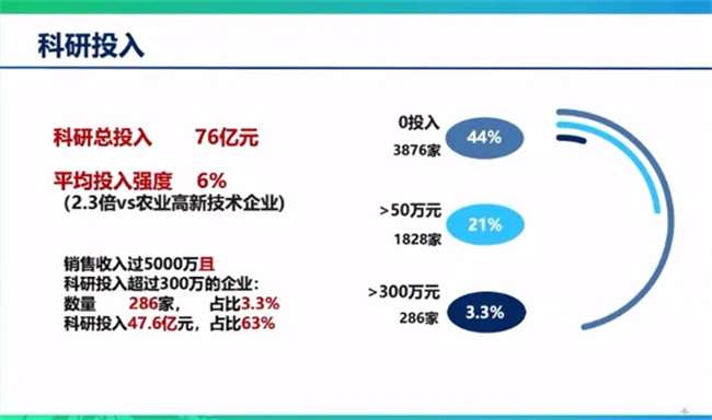 從科研投入看,全國種業(yè)企業(yè)的科研總投入76億元,平均投入強度6%。這一數(shù)據(jù)是農(nóng)業(yè)高新技術(shù)產(chǎn)業(yè)企業(yè)的2.3倍,這也體現(xiàn)了種業(yè)是高科技的產(chǎn)業(yè),是農(nóng)業(yè)的芯片。但是,也可以看出有3876家企業(yè)沒有研發(fā)投入,研發(fā)投入超過50萬元的種業(yè)企業(yè)有1828家,占比21%;銷售收入超過5,000萬元,并且科研投入超過300萬元的企業(yè)有286家,占比3.3%。