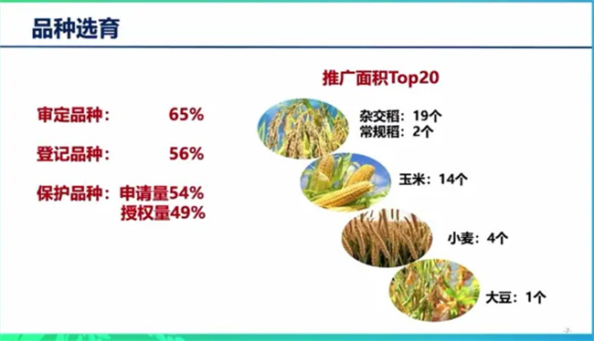 從品種的選育看,企業(yè)是品種選育的主體,通過國家級和省級審定的品種中,由企業(yè)選育的占65%。登記品種中,由企業(yè)登記的占近6成,新品種保護中有企業(yè)申請的超過50%,授權(quán)品種中有一半來自企業(yè),從推廣面積前20強的4大作物來看,有19個雜交稻、2個常規(guī)稻、14個玉米、4個小麥和1個大豆是由企業(yè)選育的。