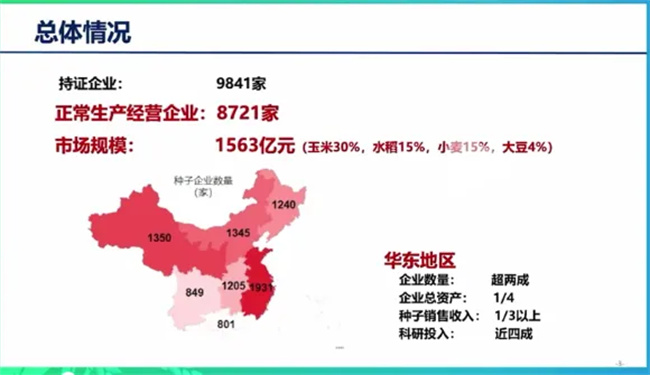 2024年10月30日,在第二十一屆全國種子雙交會上,農(nóng)業(yè)農(nóng)村部種業(yè)管理司創(chuàng)新發(fā)展處四級研究員鄧超做《我國農(nóng)作物種業(yè)企業(yè)發(fā)展情況分析》報告時指出,我國種業(yè)企業(yè)是現(xiàn)代種業(yè)發(fā)展的主力軍,是推動實現(xiàn)種業(yè)科技自立自強種源自主可控的重要力量。今年以來,種業(yè)管理司會同全國農(nóng)技中心等有關(guān)單位對我國的農(nóng)作物種業(yè)企業(yè)進行了深入分析,初步梳理了企業(yè)的構(gòu)成類型,為今后企業(yè)扶優(yōu)工作更加聚焦、更加精準、更加有力提供有力支撐??偟膩砜矗?023年全國共有持證種業(yè)企業(yè)9841家,其中正常生產(chǎn)經(jīng)營的8721家,農(nóng)作物種子市場規(guī)模首次突破1,500億元,達到了1,563億元。其中四大作物玉米、水稻、小麥、大豆占到了總產(chǎn)值的64%。從區(qū)域來看,華東地區(qū)是我國農(nóng)作物最大的優(yōu)勢區(qū),其企業(yè)數(shù)量超過全國的兩成,種子企業(yè)的總資產(chǎn)超過1/4,種子銷售收入在1/3以上,種業(yè)的科研投入占全國的近4成。