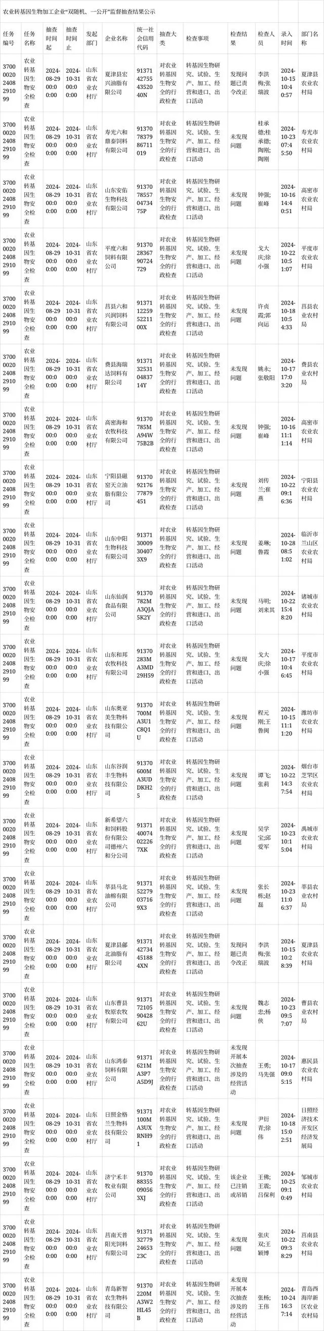 10月30日,山東省農(nóng)業(yè)農(nóng)村廳網(wǎng)站公布2024年農(nóng)業(yè)轉(zhuǎn)基因生物加工企業(yè)“雙隨機(jī)、一公開(kāi)”監(jiān)督檢查結(jié)果。