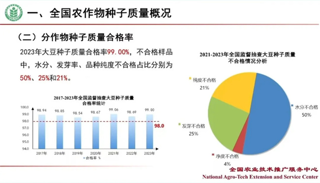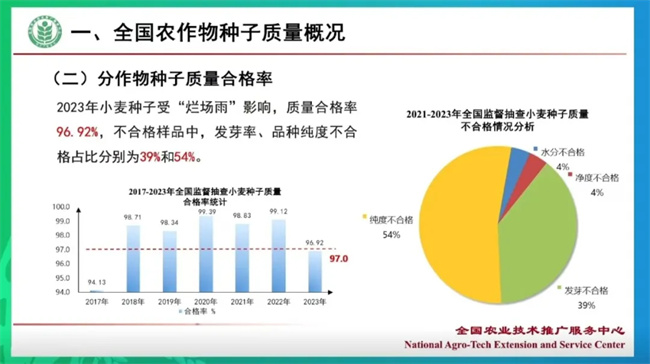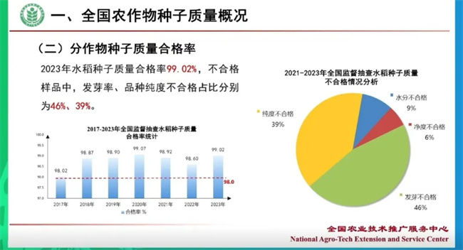 2023年玉米種子質(zhì)量合格率99.11%,不合格樣品中,發(fā)芽率、品種純度和凈度不合格占比分別為46%、24%和22%;水稻種子合格率99.02%,不合格樣品中,發(fā)芽率、品種純度不合格占比分別為46%和39%;小麥種子受“爛場雨”影響,質(zhì)量合格率為96.92%,不合格樣品中,發(fā)芽率和品種純度的不合格占比分別為39%和54%;大豆種子質(zhì)量抽檢的合格率99.00%,不合格樣品中,水分、發(fā)芽率、品種純度不合格占比分別為50%、25%和21%,提醒大家注意,大豆的水分合格率;棉花種子抽檢的合格率99.00%,不合格樣品中,發(fā)芽率、品種純度和水分不合格占比分別為68%、14%和14%;油菜抽查的合格率99.53%,不合格樣品中,發(fā)芽率、品種純度、凈度不合格占比分別為63%、12%和19%。總體來看,發(fā)芽率和純度仍然是種子質(zhì)量最大風險。