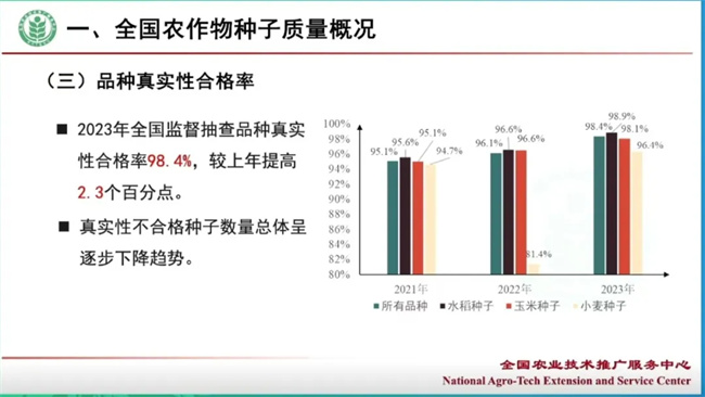 2023年全國監(jiān)督抽查品種真實性的合格率98.4%,較2022年提高了2.3%。真實性不合格的種子數(shù)量總體呈逐步下降的趨勢。