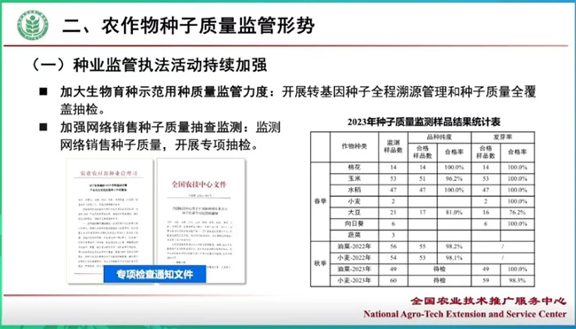 2024年繼續(xù)開展全國種業(yè)監(jiān)管執(zhí)法年活動,以主要糧食作物和重要蔬菜作物種子為重點,持續(xù)開展春季種子市場檢查,夏季制種基地檢查和秋季市場檢查,以及冬季的企業(yè)抽查的專項行動。重點是加大了生物育種示范育種的質(zhì)量監(jiān)管力度,開展轉(zhuǎn)基因種子全程的溯源管理和種子質(zhì)量的全覆蓋抽檢,加強了網(wǎng)絡(luò)銷售的質(zhì)量抽查和監(jiān)測,監(jiān)測網(wǎng)絡(luò)銷售種子質(zhì)量,并且開展了專項抽檢。