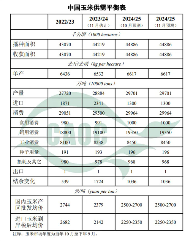 根據(jù)海關(guān)數(shù)據(jù),本月將2023/24年度中國玉米進口量上調(diào)41萬噸至2341萬噸,結(jié)余變化調(diào)整為1724萬噸,對2024/25年度預(yù)測數(shù)據(jù)不作調(diào)整。新季玉米大量上市,市場供應(yīng)充足。玉米飼用消費穩(wěn)步增加,深加工企業(yè)建庫意愿增強,玉米收儲穩(wěn)步推進,農(nóng)戶售糧進度總體快于上年。氣象部門預(yù)計11月內(nèi)蒙古、黑龍江、新疆北部等地降水偏多,對秋糧存儲、運輸可能產(chǎn)生不利影響。