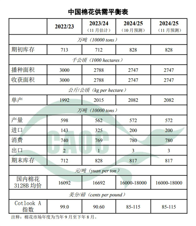 本月對新年度棉花產(chǎn)量、消費量和進口量預(yù)測維持上月預(yù)測不變。棉花采摘進入收尾階段,整體采摘進度快于往年。據(jù)國家棉花市場監(jiān)測系統(tǒng)數(shù)據(jù),截至10月31日,全國新棉采摘進度85.2%,同比提高8.5個百分點。
