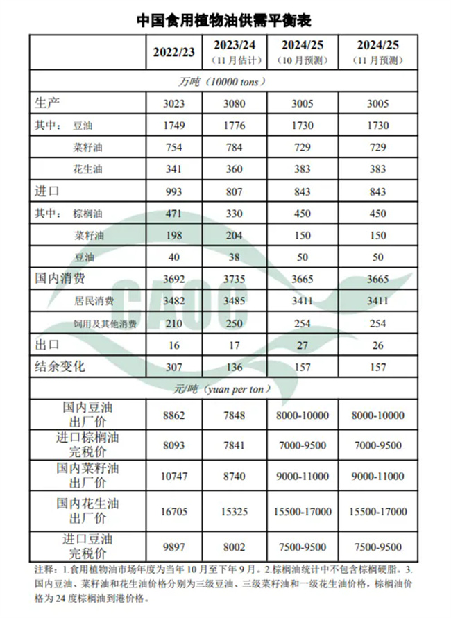 本月維持2024/25年度中國食用植物油供需預(yù)測不變。10月至今,江南大部光熱正常,利于油菜播種育苗;西南地區(qū)大部土壤墑情適宜,利于油菜移栽成活。大部地區(qū)的油菜發(fā)育期接近常年同期或偏早,后期謹防江漢東部、江南北部部分地區(qū)干旱可能對油菜造成不利影響。