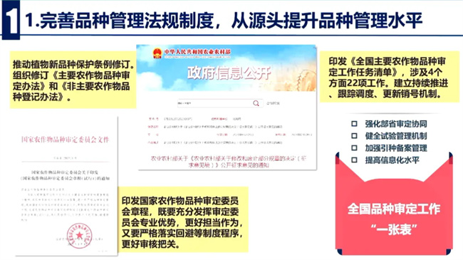 一是完善品種管理法規(guī)制度。從源頭提升品種管理水平,貫徹實施新修改種子法,配合司法部修改植物新品種保護條例,強化植物新品種保護,組織修訂主要農(nóng)作物品種審定辦法和非主要農(nóng)作物品種登記辦法,提高聯(lián)合體試驗準入門檻,強化DNA分子檢測技術(shù)應用,制定國家農(nóng)作物品種審定委員會章程,優(yōu)化工作流程,強化回避保密等廉政風險防控,嚴格依法科學公正地開展品種審定,強化部省協(xié)同,印發(fā)全國品種審定工作一張表,建立持續(xù)跟進跟蹤調(diào)度,更新銷號機制,切實提高審定品種的質(zhì)量和服務水平。