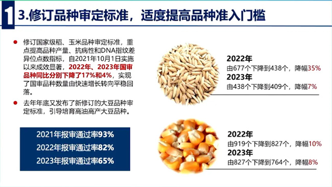三是修訂品種審定標準,適度提高品種準入門檻。圍繞適應穩(wěn)產(chǎn)保供戰(zhàn)略性需求,當前生產(chǎn)的緊迫需求和未來發(fā)展的前瞻性需求的鮮明導向,國家農(nóng)作物品種審定委員會先后修訂發(fā)布了國家水稻、玉米、大豆品種審定標準,目前正在推進修訂小麥、棉花品種審定標準,重點提高品種產(chǎn)量、品質(zhì)、抗病抗逆性和DNA分子指紋差異位點等指標要求,引導培育突破性新品種,推動地方及時修訂省級品種審定標準,同步提高品種準準入門檻,向業(yè)界傳遞從嚴要求的明確信號。近兩年,國審品種數(shù)量分別下降了17%和4%,全國審定品種數(shù)量從2023年開始回落,品種選育水平不斷提升。