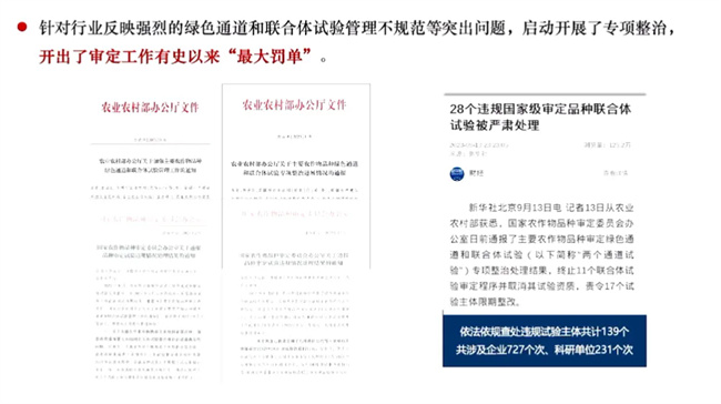2024年5月20日,農(nóng)業(yè)農(nóng)村部種業(yè)管理司召開國家主要農(nóng)作物品種審定綠色通道和聯(lián)合體試驗專項整治進展通報視頻會,通報2022年8月啟動專項整治以來工作進展情況(先后發(fā)現(xiàn)并依法依規(guī)查處問題試驗主體139個次,其中綠色通道試驗35個次、聯(lián)合體試驗104個次),強調(diào)要嚴格審定標準,合理提高審定門檻;規(guī)范品種試驗,強化各渠道試驗監(jiān)督管理;完善管理制度,盡快出臺主要農(nóng)作物品種試驗管理辦法;加強展示示范,加快優(yōu)良品種推廣應用;強化部省協(xié)同,切實提高審定品種質(zhì)量和服務水平。