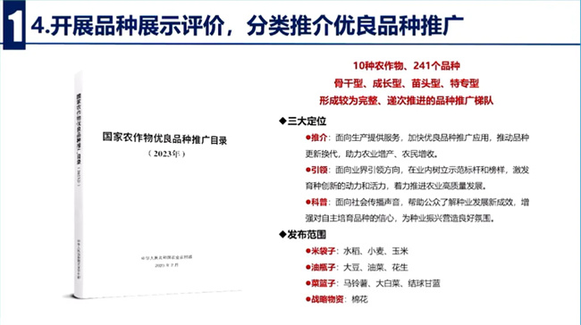 四是開展品種展示評價。分類推薦、優(yōu)良品種推廣,建立健全全國品種展示評價網(wǎng)絡,涵蓋糧、源、油、糖、蔬菜、瓜果等作物,每年展示示范的品種超過1萬個次,輻射帶動主產(chǎn)區(qū)及農(nóng)戶看禾選種。從2023年開始,農(nóng)業(yè)農(nóng)村部編制發(fā)布了國家農(nóng)作物優(yōu)良品種推廣目錄,按照骨干型、成長型、苗頭型和特專型4種類型,分類遴選,推薦水稻、小麥、玉米、大豆、油菜、花生、馬鈴薯等10種作物,241個優(yōu)良品種,推出了較為完整依次推進的品種推廣梯隊。廣西、山東、吉林等地也結(jié)合本地實際,相繼發(fā)布了省級優(yōu)良品種推廣目錄,更好地指導農(nóng)民科學選種用種,加快推動品種更新?lián)Q代。