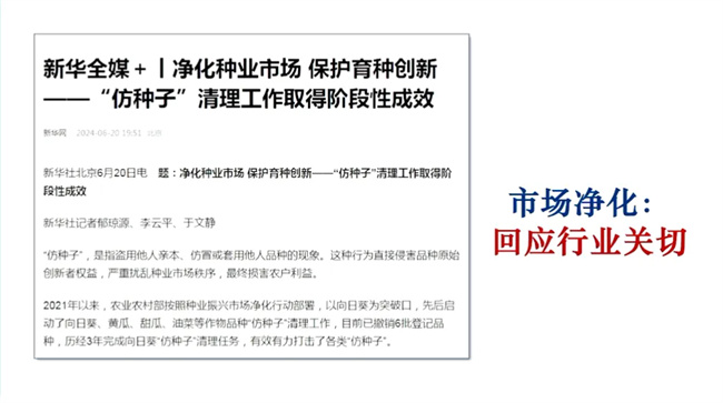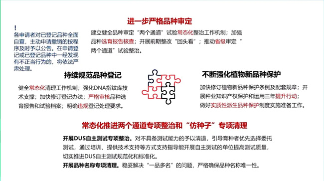 此外,近期農(nóng)業(yè)農(nóng)村部種業(yè)管理司印發(fā)了關于常態(tài)化推進品種審定綠色通道,聯(lián)合體試驗整治和仿種子清理的通知。從深化兩個通道試驗專項整治、加快防種子專項清理、嚴格自主DUS測試管理、規(guī)范品種命名管理、加強品種標準樣品管理等5個方面,明確了嚴格品種管理的具體要求和措施,同時啟動開展DUS測試專項整治和品種名稱的專項清理兩項具體行動。