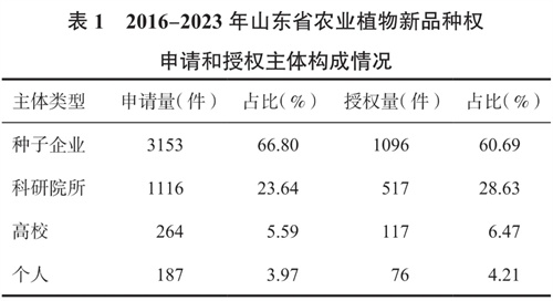 山東省獲得授權(quán)的農(nóng)業(yè)植物新品種權(quán)申請主體分別是種子企業(yè)、科研院所、高校及個人(表1)。2016-2023年種子企業(yè)是植物新品種權(quán)最主要的申請和授權(quán)主體,授權(quán)量是1096件,占比60.69%,說明企業(yè)育種創(chuàng)新積極性顯著增強(qiáng),成為了商業(yè)化育種主體。其次是科研院所,授權(quán)占比28.63%,授權(quán)植物新品種權(quán)最多的科研院所是山東省農(nóng)業(yè)科學(xué)院。高等院校和個人占比較少,分別為6.47%和4.21%。
