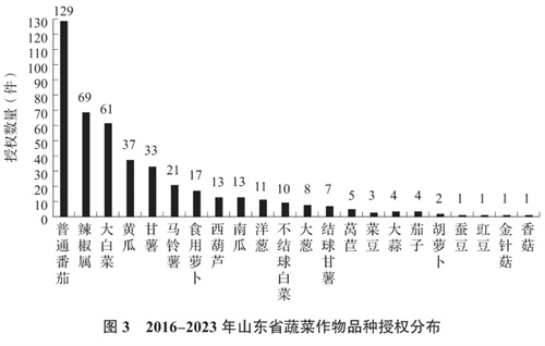 山東小麥、玉米、水稻、棉花、大豆、花生、蔬菜等農(nóng)作物常年種植面積1067萬hm²(1.6億畝)左右,產(chǎn)量常年穩(wěn)居全國前10位,在山東農(nóng)業(yè)中占有至關(guān)重要的地位。截至目前,農(nóng)業(yè)農(nóng)村部發(fā)布了11批農(nóng)業(yè)植物品種保護(hù)名錄,共涉及191個植物屬(種)。由圖2可知,2016-2023年間山東省農(nóng)業(yè)植物新品種權(quán)授權(quán)品種主要集中在大田作物、蔬菜和水果,品種涵蓋40個屬(種),占農(nóng)業(yè)農(nóng)村部發(fā)布的保護(hù)名錄的20.94%。其中大田作物占比最多,達(dá)到63.41%,蔬菜占比26.52%,大田作物和蔬菜共占到89.93%,花卉及其他分別占比為1.77%和0.33%。大田作物申請和授權(quán)品種主要集中在玉米和普通小麥上,其次是水稻、大豆、花生、棉屬。其中,玉米授權(quán)量518件,占大田作物授權(quán)量的45.24%,比例最大。蔬菜類新品種授權(quán)主要涉及22個品種(圖3),普通番茄、辣椒屬、大白菜居前3位。這與山東省在大田作物和蔬菜方面育種科研水平較高有關(guān)。