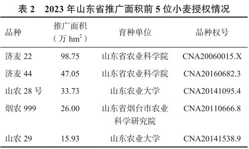 目前全國推廣面積前15位的品種山東省共有6個,其中,濟(jì)麥22、濟(jì)麥44、山農(nóng)28號、煙農(nóng)999、山農(nóng)29均獲得植物新品種權(quán)(表2),為糧食增產(chǎn)作出了重要貢獻(xiàn)。據(jù)統(tǒng)計,2023年濟(jì)麥22在山東推廣面積高達(dá)98.75萬hm²,是山東省當(dāng)家小麥品種。在蔬菜方面,通過舉辦山東國際蔬菜種業(yè)博覽會和春秋兩季品種展示觀摩活動,向社會推介辣椒、番茄、黃瓜、白菜等11類表現(xiàn)優(yōu)良品種274個,品種國產(chǎn)替代取得突破性進(jìn)展。