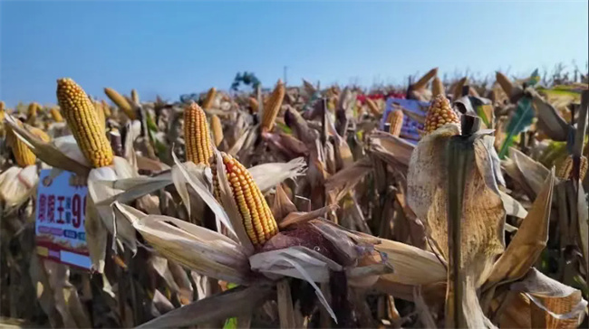 黃斤玉浚黎99測產(chǎn)田,呈現(xiàn)出一派豐收景象。金黃色的玉米穗子大小勻稱,每一顆籽粒都充盈飽滿。經(jīng)過將近150天的種植,浚黎99依然存有青葉,站稈能力得到參會人員的高度肯定和認可。