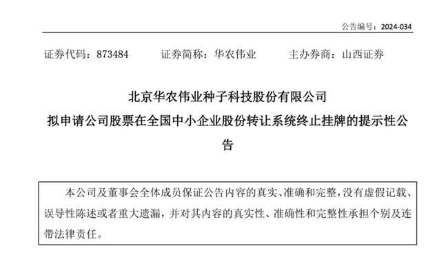 11月18日,新三板掛牌種企——北京華農(nóng)偉業(yè)種子科技股份有限公司(以下簡稱“華農(nóng)偉業(yè)”)發(fā)布公告,均關(guān)于擬申請股票終止掛牌。