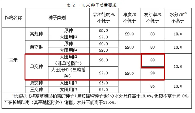 常規(guī)種和單交種(非單粒播種種子)發(fā)芽率由“不低于85%”調(diào)整為“不低于88%”