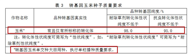 轉(zhuǎn)基因玉米單交種大田用種執(zhí)行單粒播種種子質(zhì)量要求;