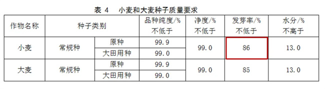 小麥常規(guī)種發(fā)芽率“不低于85%”調(diào)整為“不低于86%”