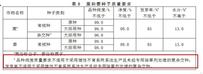 將粟和黍指標(biāo)分別規(guī)定;增加了采用雄性不育兩系法制種的特殊規(guī)定。考慮采用雄性不育系兩系法生產(chǎn)的母本具有一定的自交結(jié)實(shí)特性,雜交種中含有一定的不育系,純度較低,經(jīng)專用除草劑處理后純度提高但發(fā)芽率較低。