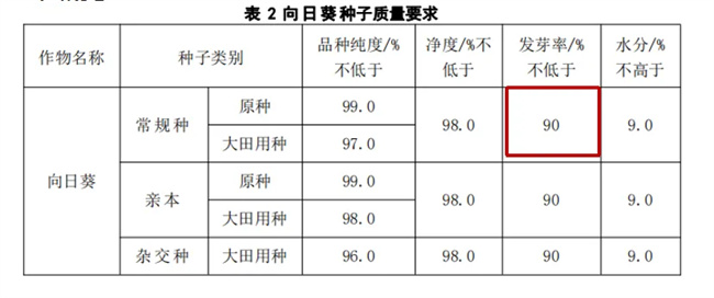 將向日葵常規(guī)種發(fā)芽率與雜交種保持一致,將常規(guī)種大田用種發(fā)芽率由“不低于85%”調(diào)整為“不低于90%”