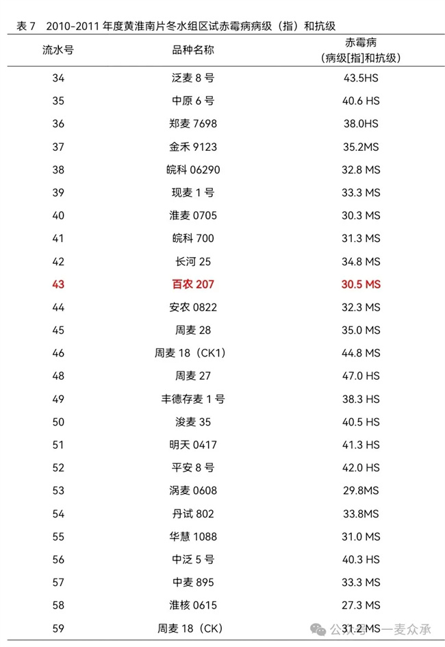 經(jīng)土表接種抗侵染型鑒定,百農(nóng)207表現(xiàn)高感,但其發(fā)病指數(shù)僅略高于豐德存麥1號、煙5158、淮麥28、徐麥33、中麥895和西農(nóng)538等6個品種,與中感對照品種鄭麥0943接近,低于中麥175、明麥16、徐麥30、濟(jì)麥22、周麥16等38個品種。