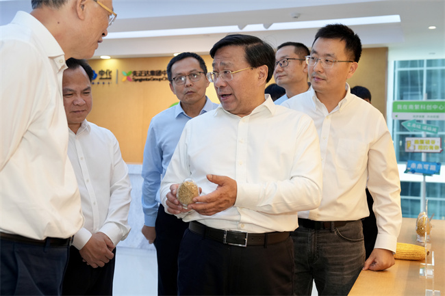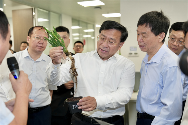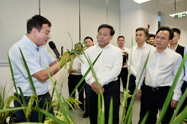 中種集團是全國首批育繁推一體化種業(yè)企業(yè),近年來持續(xù)加強品種攻關(guān),培育出耐鹽堿大豆、低鎘積累水稻等新品種。韓俊現(xiàn)場查看有關(guān)品種,了解集團創(chuàng)新發(fā)展及共建南繁硅谷情況,勉勵中種集團對標國際一流種業(yè)企業(yè),培育推廣更多高產(chǎn)優(yōu)質(zhì)新品種。他強調(diào),企業(yè)是種業(yè)創(chuàng)新的主體,要著力推進企業(yè)主導(dǎo)的產(chǎn)學(xué)研深度融合,大力培育種業(yè)領(lǐng)域科技領(lǐng)軍企業(yè),支持企業(yè)承擔重大項目,深化科企協(xié)同創(chuàng)新,抓好科研成果轉(zhuǎn)化應(yīng)用,加快構(gòu)建商業(yè)化育種體系。
