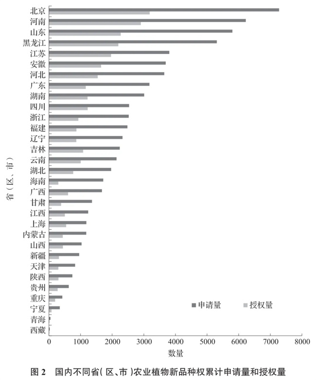 從全國范圍來看,農(nóng)業(yè)植物新品種權(quán)申請量和授權(quán)量排在前10位的?。▍^(qū)、市)分別是北京、河南、山東、黑龍江、江蘇、安徽、河北、廣東、湖南和四川,山西省的申請量和授權(quán)量居第23位和第20位(圖2)。可以看出,與國內(nèi)農(nóng)業(yè)和種業(yè)大省(市)相比,山西省農(nóng)業(yè)植物新品種權(quán)的申請量和授權(quán)量都相對較低,在農(nóng)業(yè)創(chuàng)新和品種改良方面還有很大的提升空間。品種權(quán)申請授權(quán)率一定程度上能夠體現(xiàn)植物新品種的研發(fā)技術(shù)水平和效率。通過統(tǒng)計,山西省的申請授權(quán)率居全國第12位,說明在農(nóng)業(yè)植物新品種的研發(fā)方面山西省還是具有較強的能力和技術(shù)水平,研發(fā)的新品種在質(zhì)量上相對較高,滿足了授權(quán)的標準,有較高的認可度。