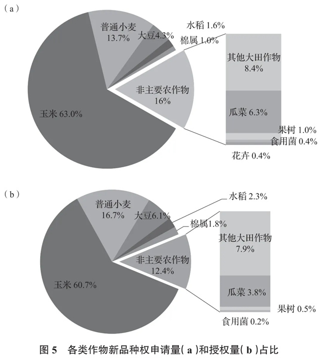 截至2023年底,山西省申請農(nóng)業(yè)植物新品種權(quán)的作物共36種,包括玉米、普通小麥、大豆、谷子、普通西瓜、高粱、水稻、西葫蘆、棉屬、南瓜、綠豆、普通番茄、甘薯等,授權(quán)19種(表1)。其中,五大主要農(nóng)作物水稻、玉米、小麥、大豆和棉花均有申請和授權(quán),數(shù)量分別占山西省申請和授權(quán)總量的83.6%和87.6%。玉米品種權(quán)申請量和授權(quán)量最大,分別占比63.0%和60.7%,遠超其他作物(圖5)。這可能與主要農(nóng)作物種質(zhì)資源豐富、需求量大及品種選育歷史悠久、成效顯著有關(guān)。此外,山西省對這些作物品種研發(fā)的重點支持可能也進一步推動了相關(guān)育種和改良工作。除去這5種主要農(nóng)作物,山西省申請和授權(quán)的非主要農(nóng)作物可分為其他大田作物、瓜菜、花卉、果樹和食用菌5個類型。從圖5可以看出,5類非主要農(nóng)作物中,其他大田作物申請新品種權(quán)數(shù)量最多,授權(quán)量也相應(yīng)較多,其次是瓜菜,果樹、食用菌和花卉類型相對較少。各作物新品種權(quán)申請量和授權(quán)量呈現(xiàn)出明顯的不平衡狀態(tài)。