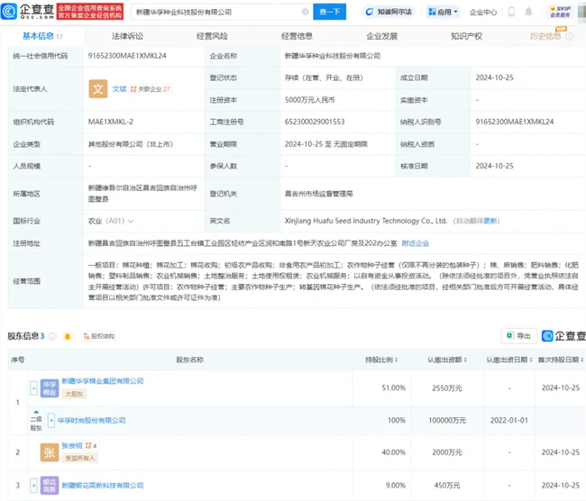 日前,一家名為新疆華孚種業(yè)科技股份有限公司(下稱“新疆華孚種業(yè)”)的新企業(yè)正式成立,該企業(yè)的法定代表人為文斌,注冊資本為5000萬元。