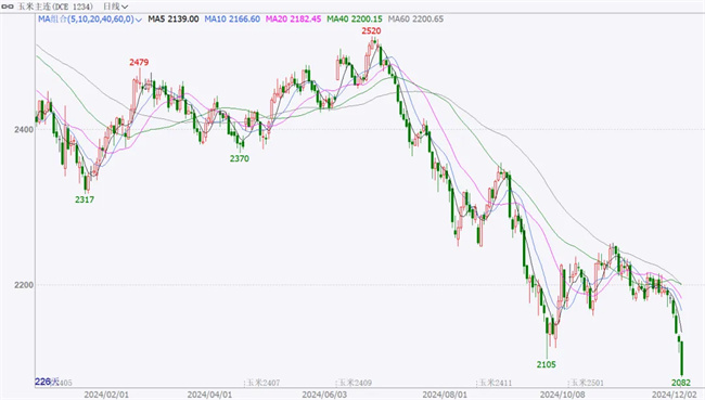 玉米期貨創(chuàng)出2020年7月以來新低,12月4日主力合約收盤報(bào)2084元/噸,當(dāng)日最低2082元/噸?,F(xiàn)貨方面,去年玉米還能賣到1.3元/斤左右,今年9-10月,部分地區(qū)玉米只能賣到0.95元/斤左右。
