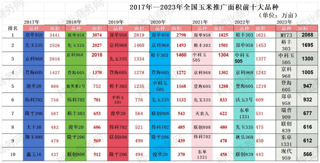 京科968:始終位居前四。2017-2018年,為全國推廣面積第三大品種,2019-2020年排名上升至第二,2021-2023年均排名第四。