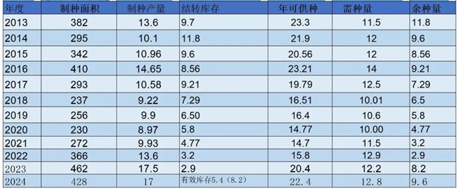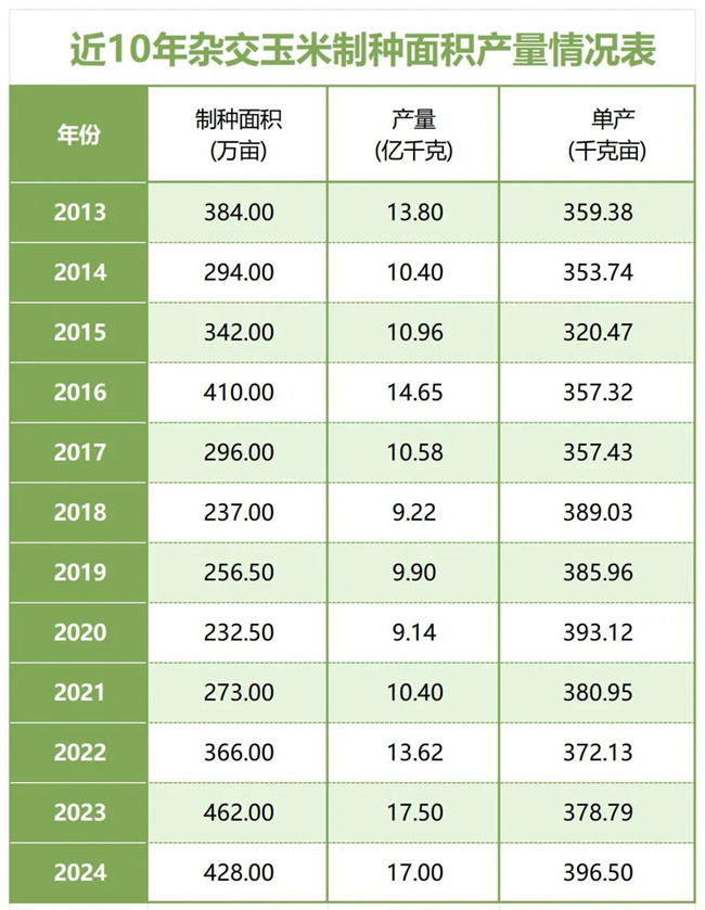2016年以來(lái),全國(guó)玉米制種面積和產(chǎn)量呈先減后增態(tài)勢(shì)。玉米制種面積由2016年的410萬(wàn)畝,下降到2020年的230萬(wàn)畝,后逐步增加,2023年制種面積大幅回彈至462萬(wàn)畝,2024年,428萬(wàn)畝。