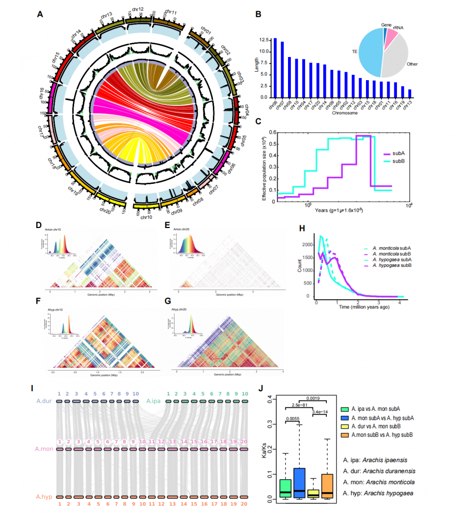 科研團(tuán)隊(duì)利用PSMC分析發(fā)現(xiàn),花生的A亞基因組(subgenome A, subA)和B亞基因組(subgenome B, subB)都在大約4000年前發(fā)生了有效群體的擴(kuò)張,這一時(shí)間點(diǎn)與最早發(fā)現(xiàn)的花生時(shí)間相吻合,暗示了該時(shí)間可能是花生栽培種四倍化事件發(fā)生的時(shí)間。進(jìn)一步對(duì)著絲粒區(qū)域的研究發(fā)現(xiàn),subB上該區(qū)域的重復(fù)序列高于subA,但subB上年輕重復(fù)序列的比例較少,這表明較慢的重復(fù)序列清除速度,而非更多的重復(fù)序列插入,是導(dǎo)致subB上該區(qū)域重復(fù)序列含量更高的原因。此外,subA的著絲粒區(qū)域較subB包含了更多的串聯(lián)重復(fù)基因,這些基因的功能主要與蛋白質(zhì)折疊和運(yùn)輸相關(guān),其育種方面的意義有待進(jìn)一步挖掘。