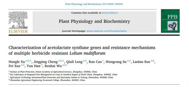 近日,我院植保所農(nóng)藥研究團(tuán)隊在植物保護(hù)研究領(lǐng)域國際知名期刊Plant Physiology and Biochemistry(JCR一區(qū),TOP期刊)和Crop Protection(JCR一區(qū))在線發(fā)表了題為 “Characterization of acetolactate synthase genes and resistance mechanisms of multiple herbicide resistant Lolium multifforum”和“The synergistic effect and mechanism of different adjuvants on pinoxaden efffcacy against Lolium multifforum Lam”的研究論文。首次發(fā)現(xiàn)并報道了我省多花黑麥草對甲氧咪草煙的抗藥性,明確了抗性多花黑麥草中ALS氨基酸的突變及多拷貝現(xiàn)象介導(dǎo)了其對甲氧咪草煙的抗藥性,解析了抗性多花黑麥草所具有的多重抗性機(jī)制。同時,針對多花黑麥草的抗性問題,該團(tuán)隊結(jié)合自主研發(fā)的除草劑增效劑,報道了通過添加增效劑“噴霧寶”可有效提高唑啉草酯對多花黑麥草的防除效果,并進(jìn)一步解析了其增效機(jī)制,為抗性雜草的防除提供了重要理論支持和實踐指導(dǎo)。