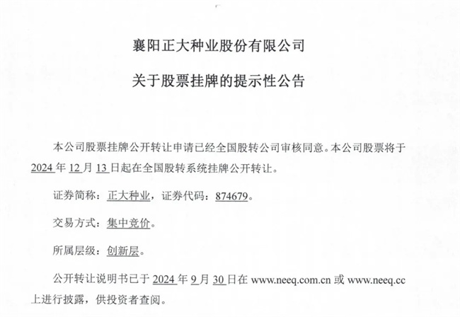 12月13日,襄陽正大種業(yè)股份有限公司正式在全國中小企業(yè)股份轉(zhuǎn)讓系統(tǒng)(新三板)創(chuàng)新層掛牌。