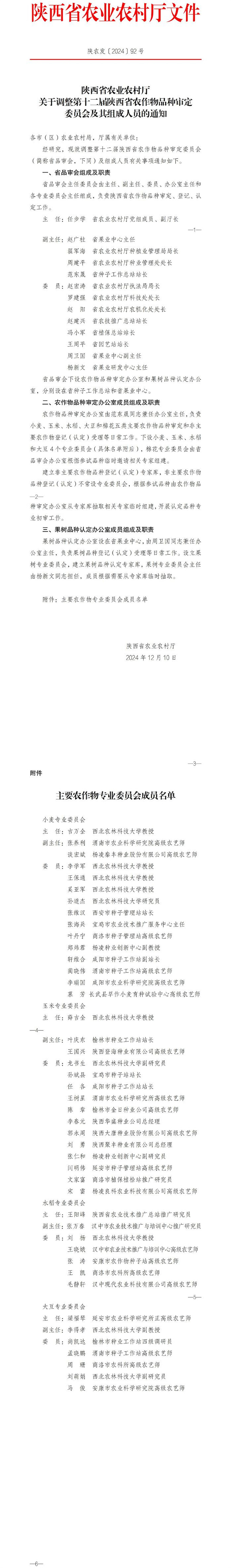 關(guān)于調(diào)整第十二屆陜西省農(nóng)作物品種審定委員會及其組成人員的通知