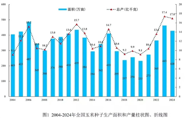 2004-2024全國玉米種子生產(chǎn)面積和產(chǎn)量變化